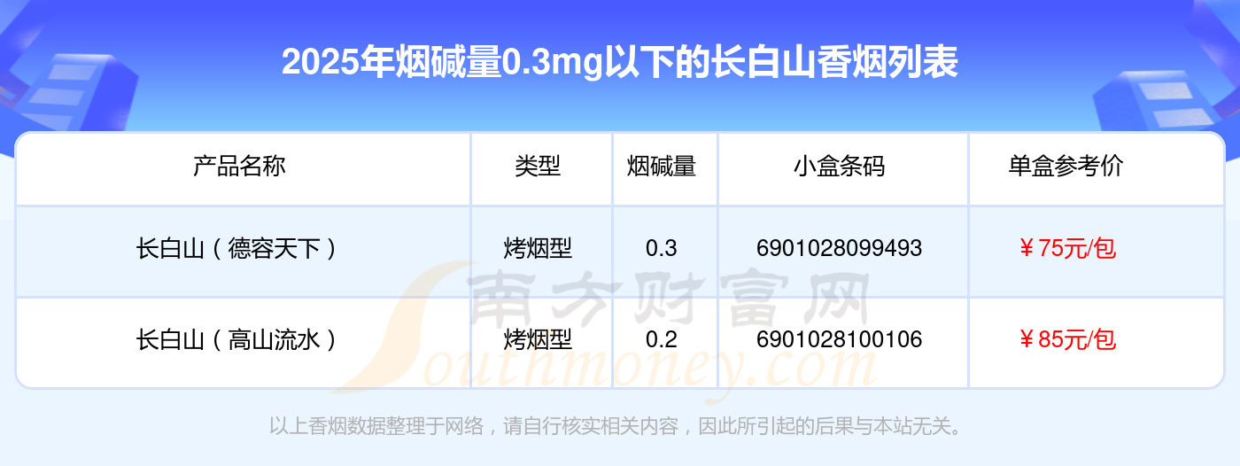 擇煙網(wǎng)為大家盤點(diǎn)了煙堿量0.3mg以下的長白山香煙,有長白山(德容天下)、長白山(高山流水)等,詳細(xì)價格如下: