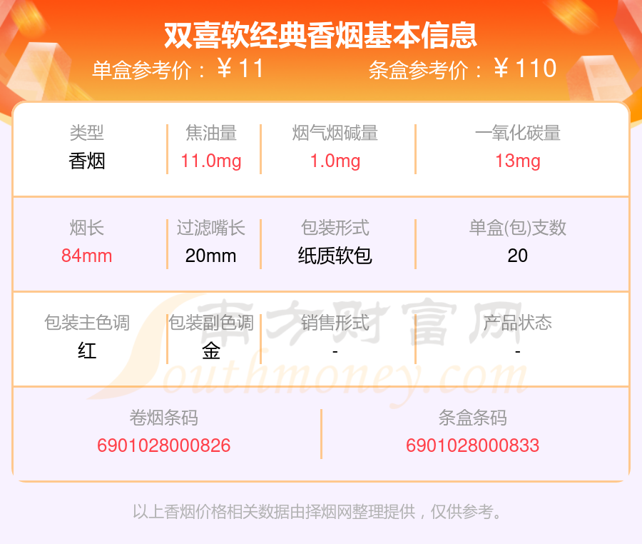 雙喜軟經(jīng)典條盒參考價(jià):110元