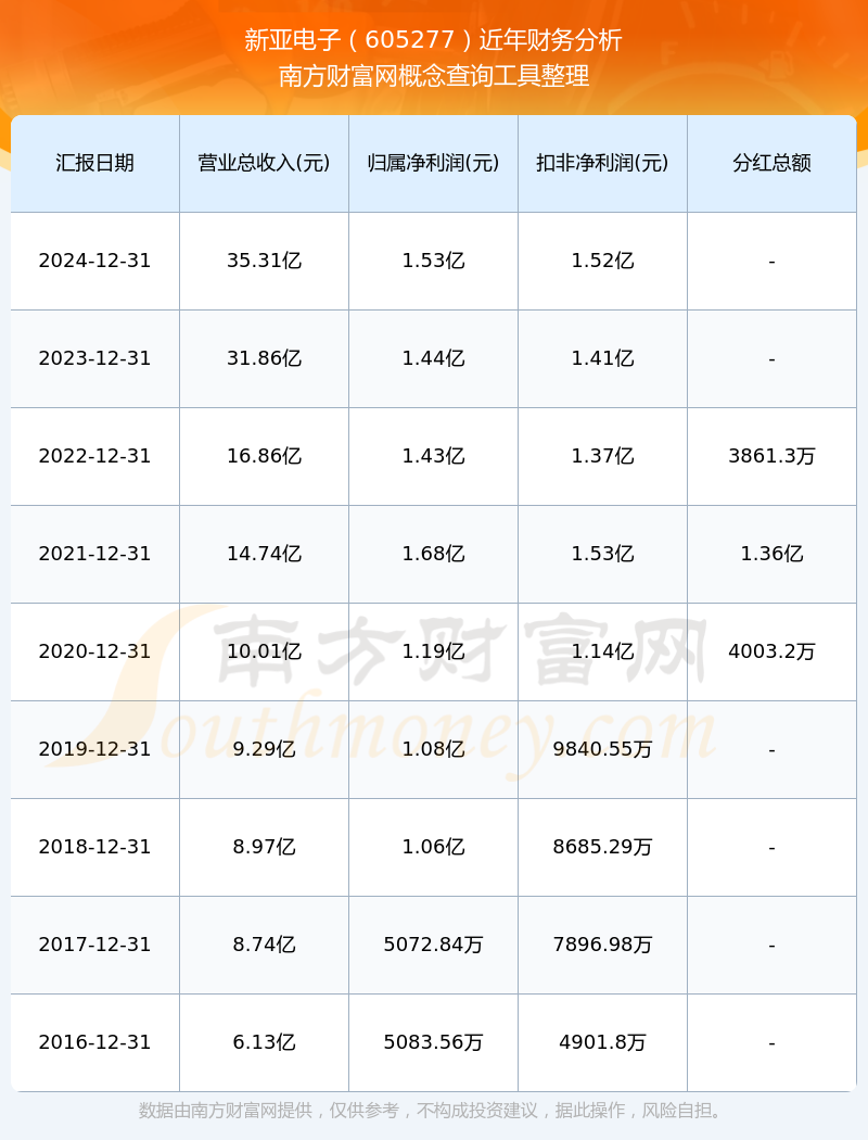 新亞電子2024年總營收35.31億,同比增長10.84%;凈利潤1.53億,同比增長6%;銷售毛利率14.96%。