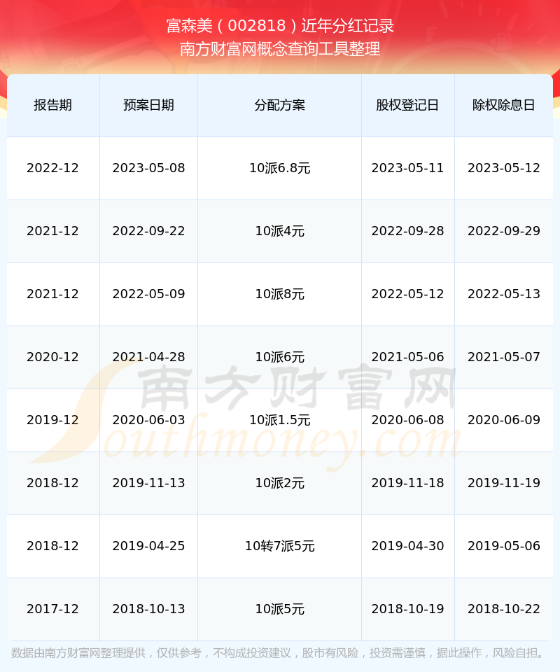 富森美最新一次公布的分紅方案為10派6.8元。本次權益分派股權登記日為2023年5月11日,除權除息日為2023年5月12日,派息日為2023年5月12日。