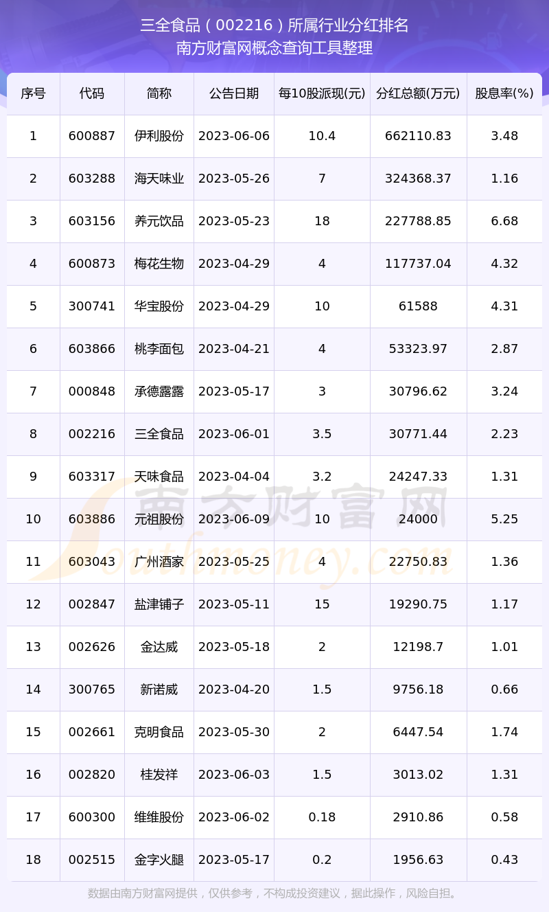 按照南方財(cái)富網(wǎng)趨勢選股系統(tǒng)統(tǒng)計(jì),三全食品所屬行業(yè)為食品飲料行業(yè),食品飲料行業(yè)分紅排名情況如下表: