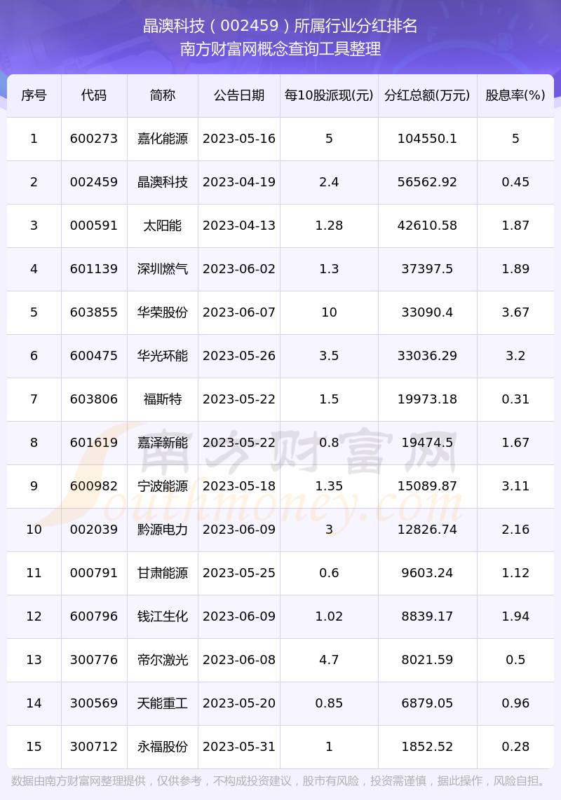 按照南方財富網(wǎng)趨勢選股系統(tǒng)統(tǒng)計,晶澳科技所屬行業(yè)為光伏設備行業(yè),光伏設備行業(yè)分紅排名情況如下表: