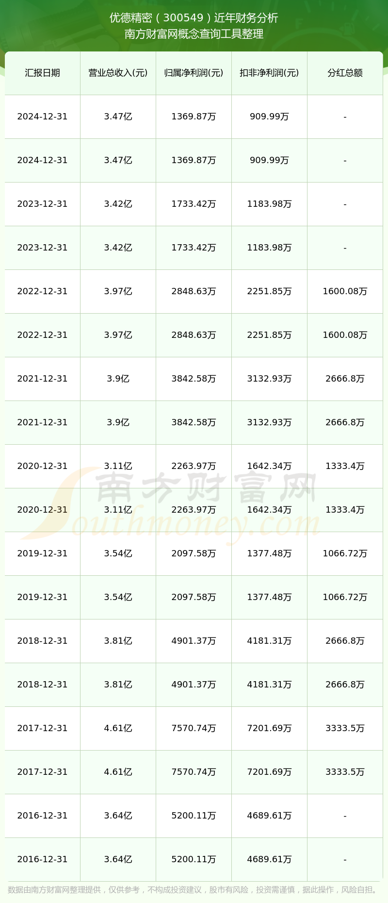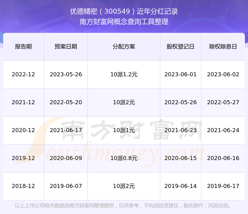 近年優(yōu)德精密分紅派息情況如下表所示:
