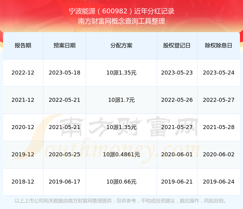 寧波能源最新一次公布的分紅方案為10派1.35元。本次權(quán)益分派股權(quán)登記日為2023年5月23日,除權(quán)除息日為2023年5月24日,派息日為2023年5月24日。