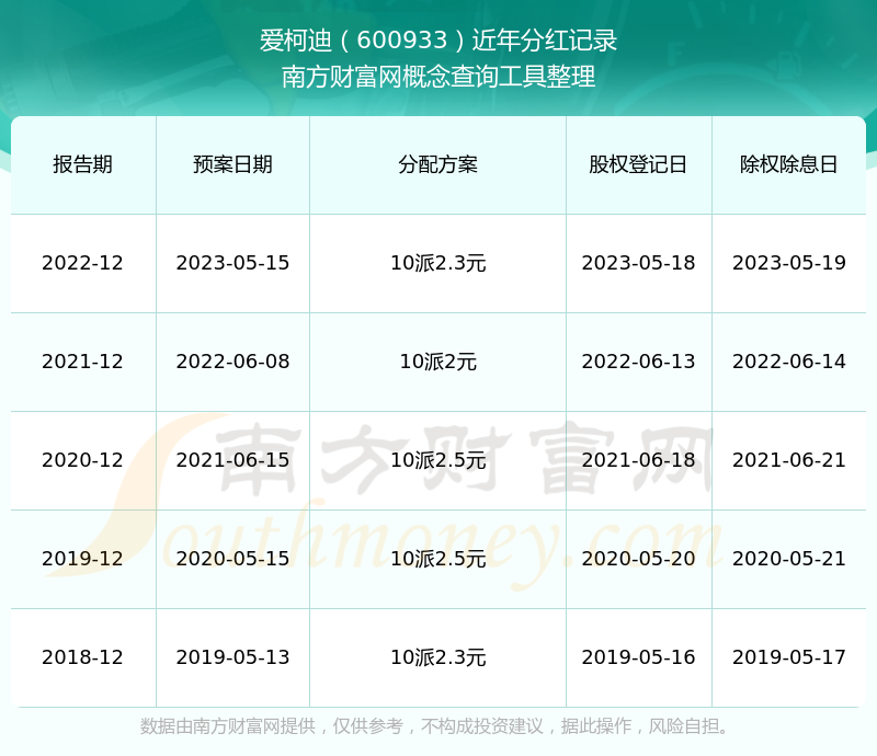 愛柯迪最新一次公布的分紅方案為10派2.3元。本次權(quán)益分派股權(quán)登記日為2023年5月18日,除權(quán)除息日為2023年5月19日,派息日為2023年5月19日。
