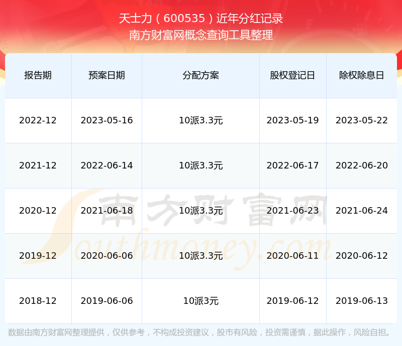 天士力最新一次公布的分紅方案為10派3.3元。本次權(quán)益分派股權(quán)登記日為2023年5月19日,除權(quán)除息日為2023年5月22日,派息日為2023年5月22日。