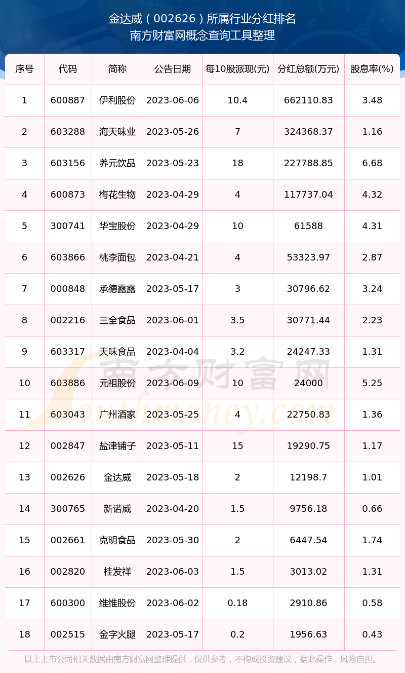 按照南方財(cái)富網(wǎng)趨勢選股系統(tǒng)統(tǒng)計(jì),金達(dá)威所屬行業(yè)為保健食品行業(yè),保健食品行業(yè)分紅排名情況如下表: