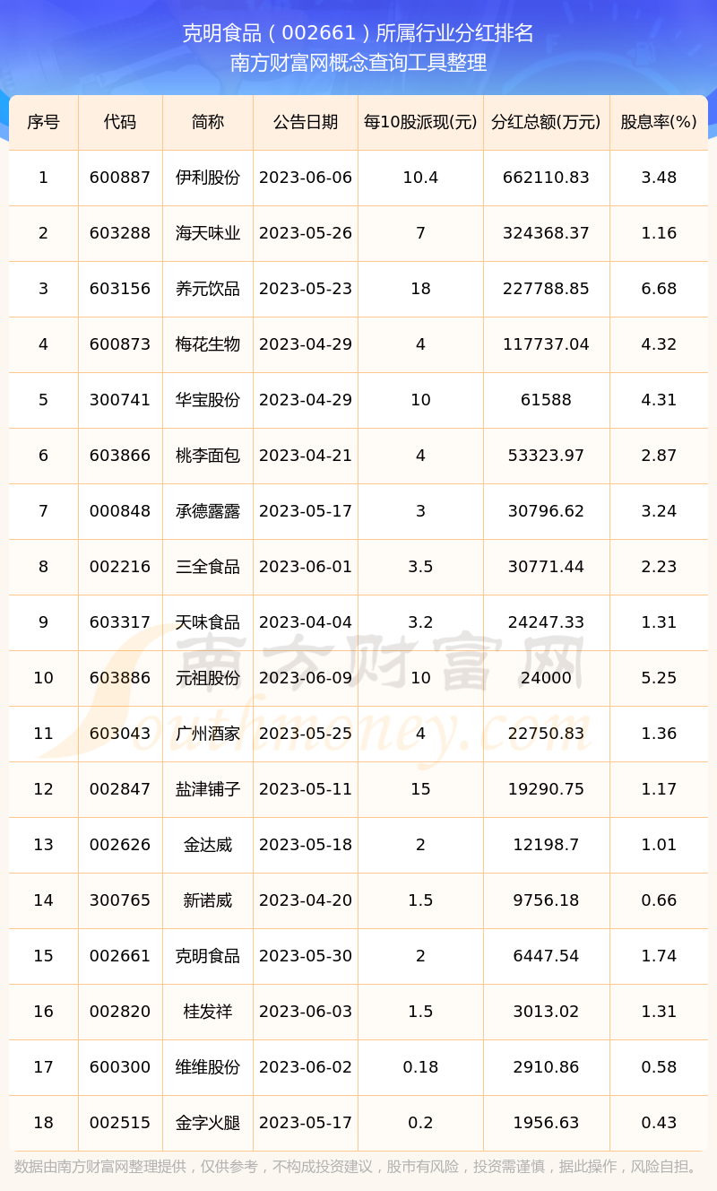 二、克明食品002661行業(yè)分紅排名