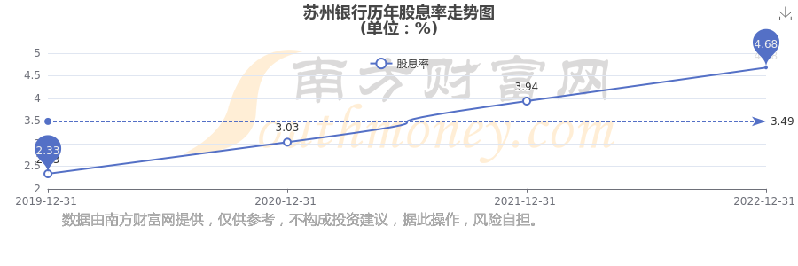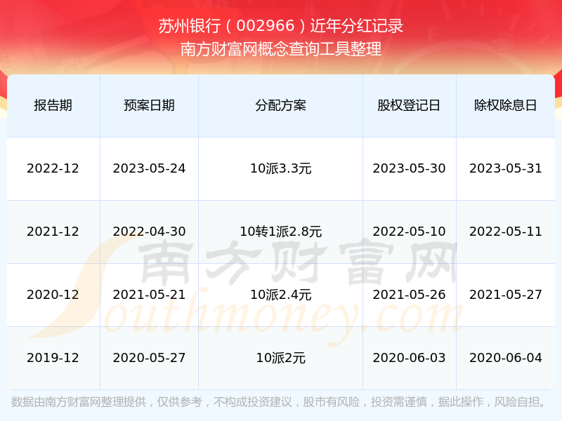 蘇州銀行最新一次公布的分紅方案為10派3.3元。本次權(quán)益分派股權(quán)登記日為2023年5月30日,除權(quán)除息日為2023年5月31日,派息日為2023年5月31日。