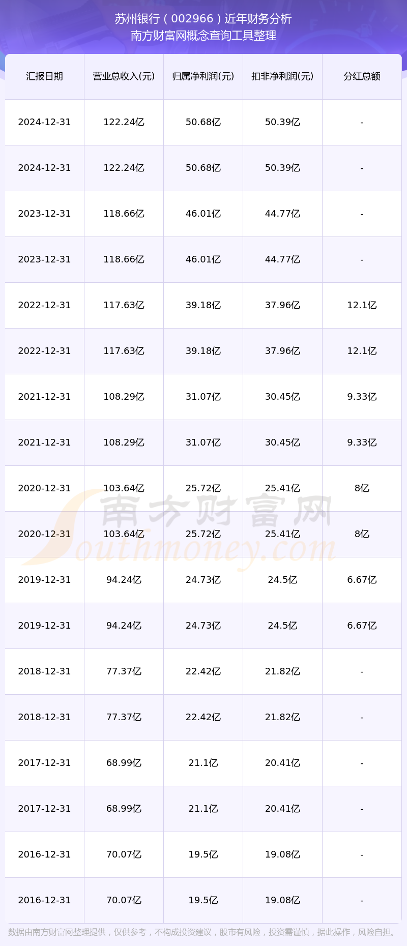 蘇州銀行公司2024年實(shí)現(xiàn)營業(yè)收入122.24億元,同比增長3.01%;凈利潤50.68億元。