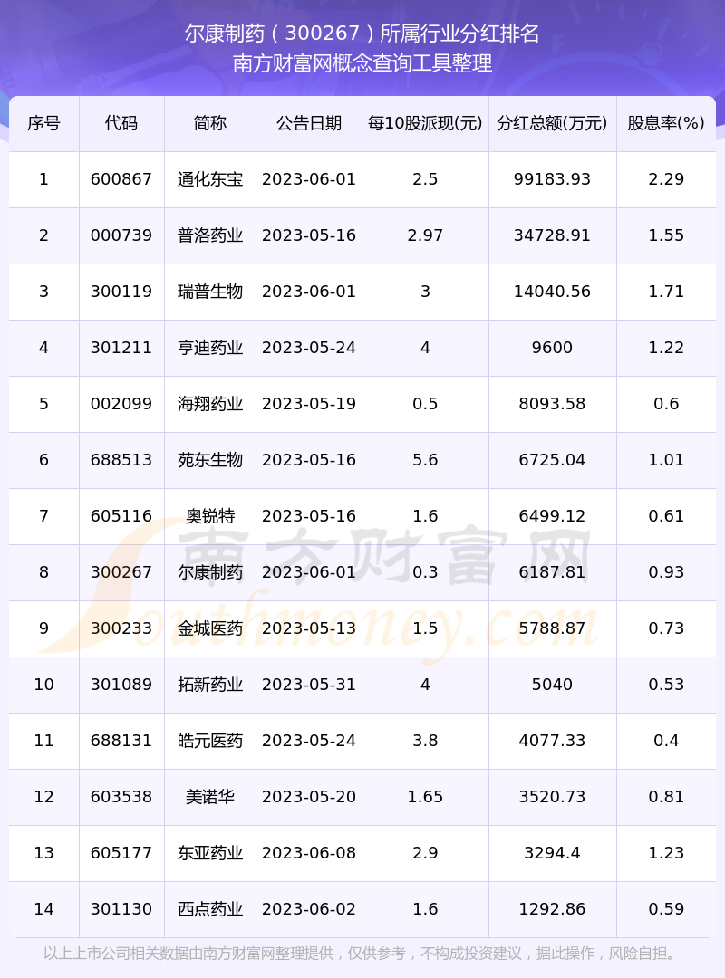 按照南方財富網(wǎng)趨勢選股系統(tǒng)統(tǒng)計,爾康制藥所屬行業(yè)為藥用輔料行業(yè),藥用輔料行業(yè)分紅排名情況如下表: