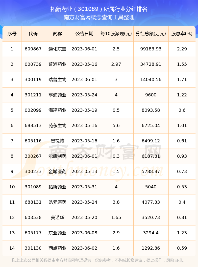 二、拓新藥業(yè)301089行業(yè)分紅排名