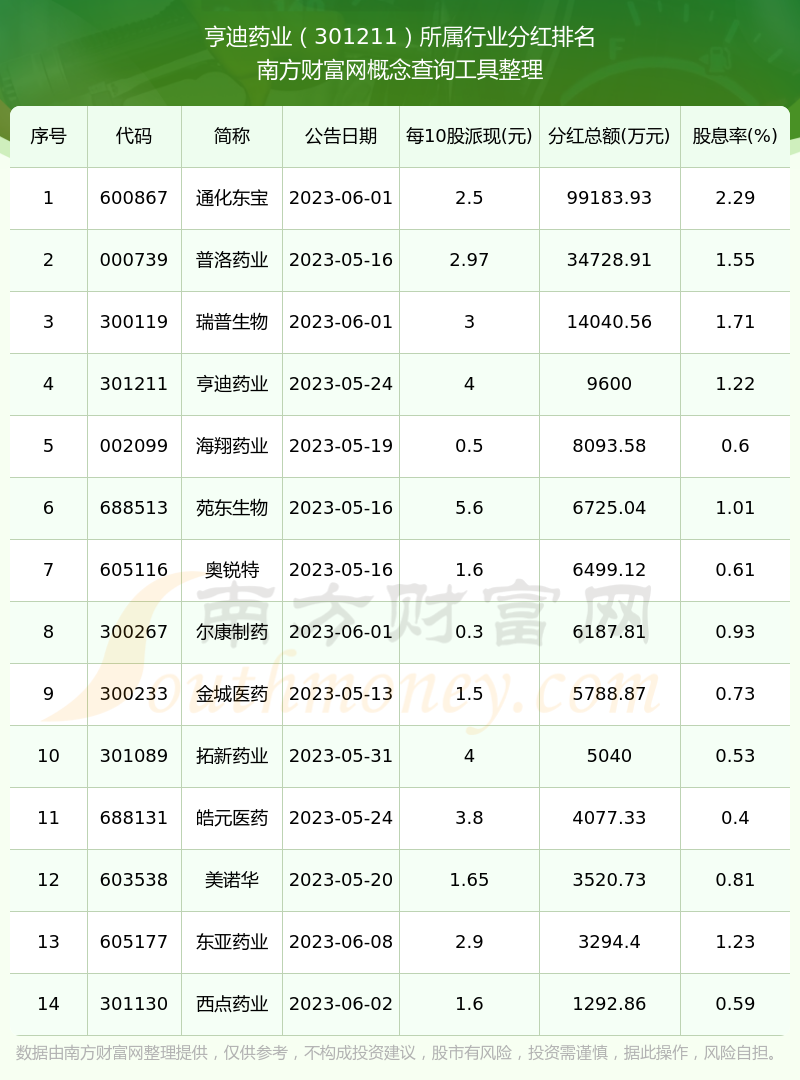二、亨迪藥業(yè)301211行業(yè)分紅排名