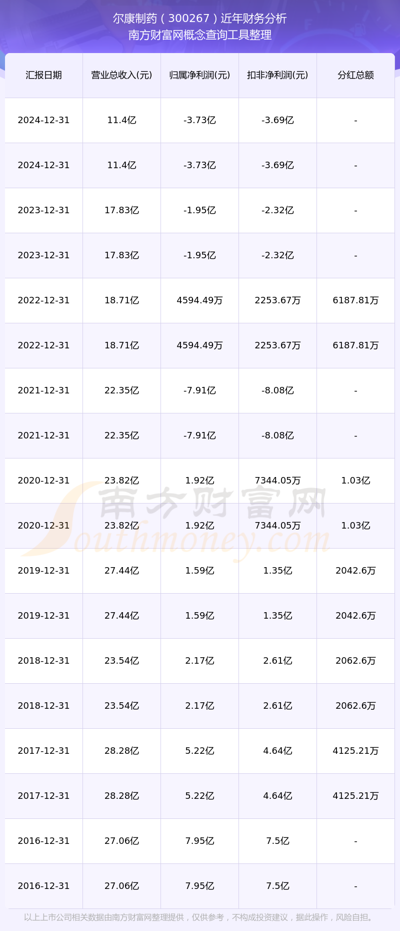 爾康制藥2024年總營收11.4億,同比增長-36.09%;凈利潤-3.73億,同比增長-91.16%;銷售毛利率27.52%。