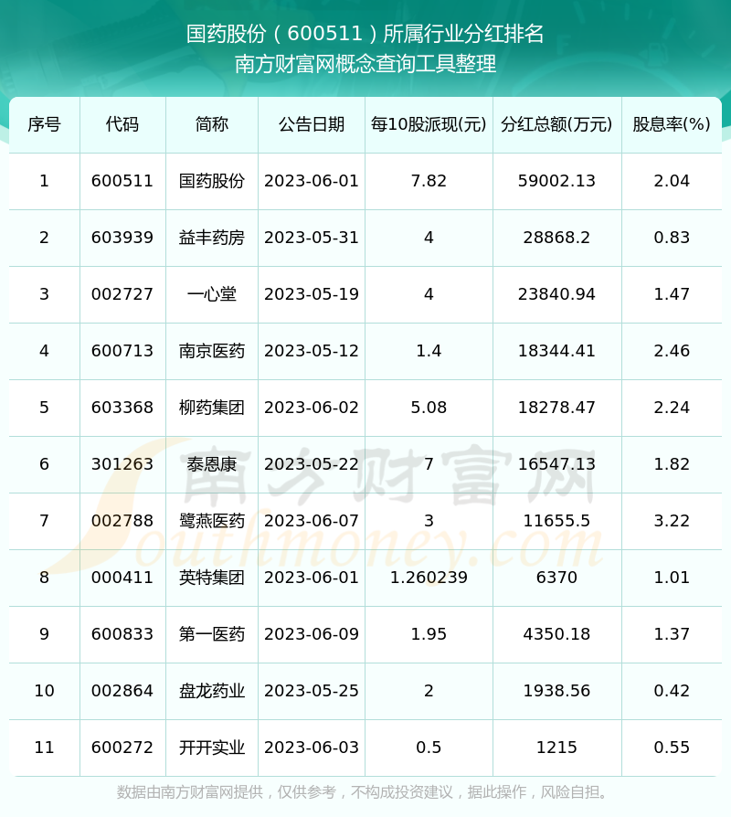 按照南方財富網(wǎng)趨勢選股系統(tǒng)統(tǒng)計,國藥股份所屬行業(yè)為醫(yī)藥商業(yè)行業(yè),醫(yī)藥商業(yè)行業(yè)分紅排名情況如下表: