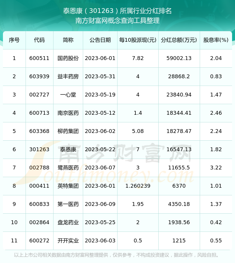 按照南方財富網(wǎng)趨勢選股系統(tǒng)統(tǒng)計,泰恩康所屬行業(yè)為醫(yī)藥商業(yè)行業(yè),醫(yī)藥商業(yè)行業(yè)分紅排名情況如下表: