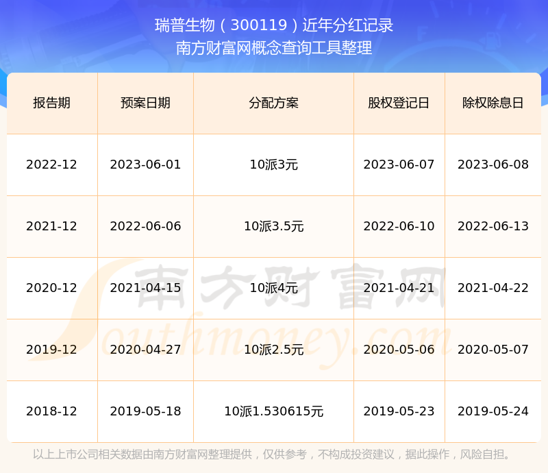 瑞普生物最新一次公布的分紅方案為10派3元。本次權(quán)益分派股權(quán)登記日為2023年6月7日,除權(quán)除息日為2023年6月8日,派息日為2023年6月8日。