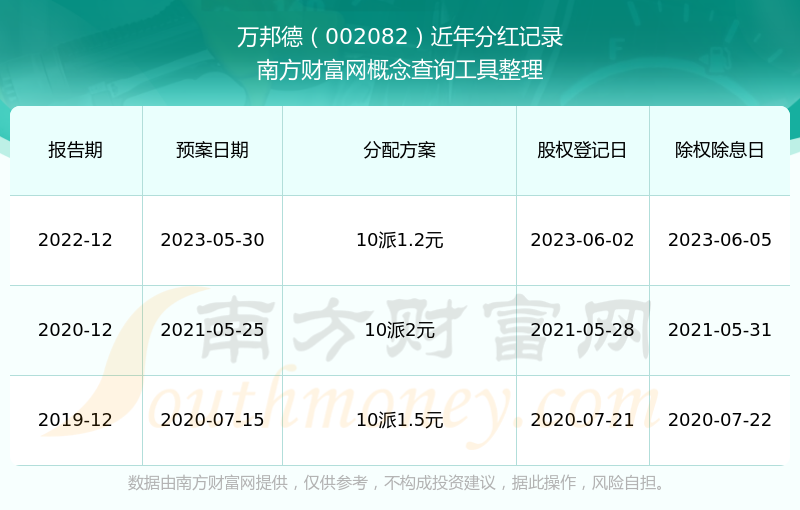 萬邦德最新一次公布的分紅方案為10派1.2元。本次權(quán)益分派股權(quán)登記日為2023年6月2日,除權(quán)除息日為2023年6月5日,派息日為2023年6月5日。