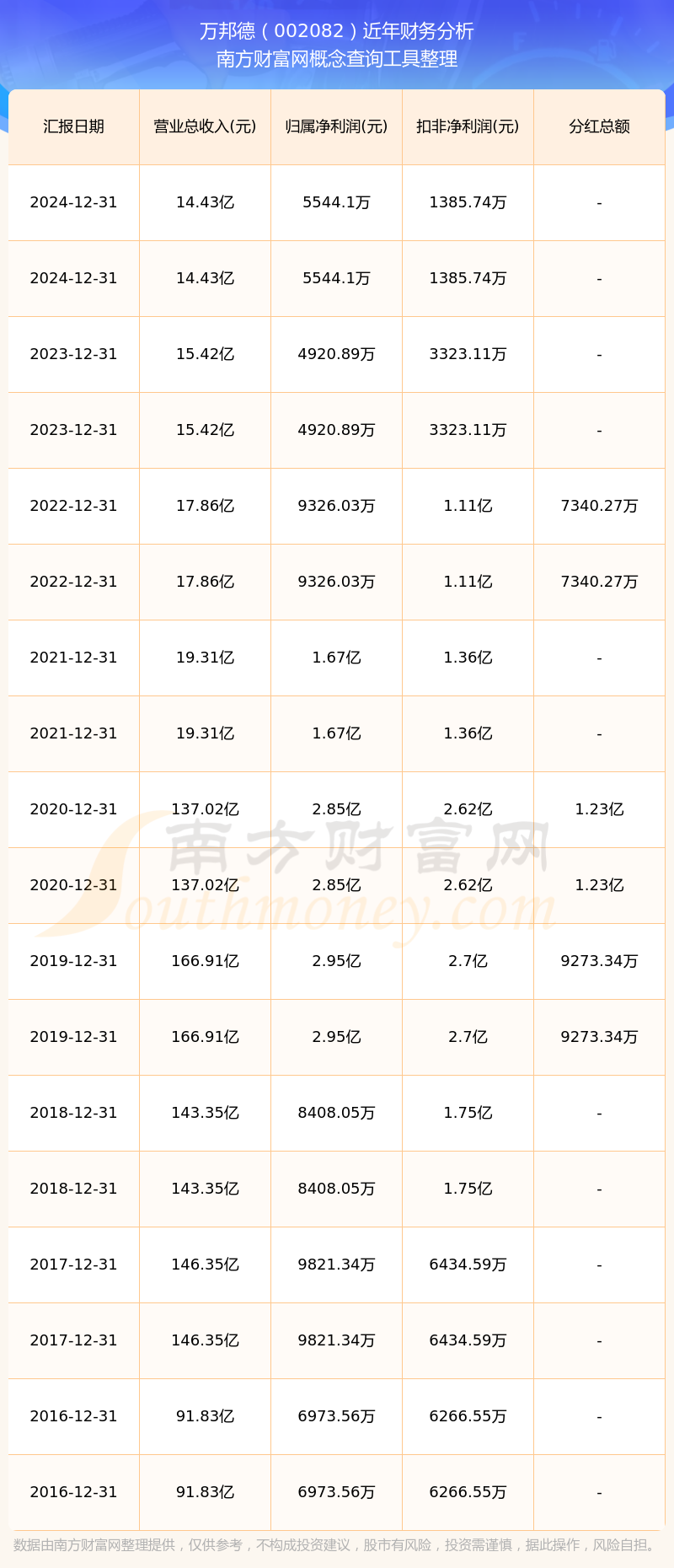 萬邦德歷年分紅派息情況如下表所示: