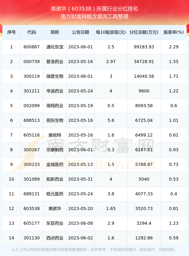 按照南方財(cái)富網(wǎng)趨勢(shì)選股系統(tǒng)統(tǒng)計(jì),美諾華所屬行業(yè)為原料藥行業(yè),原料藥行業(yè)分紅排名情況如下表: