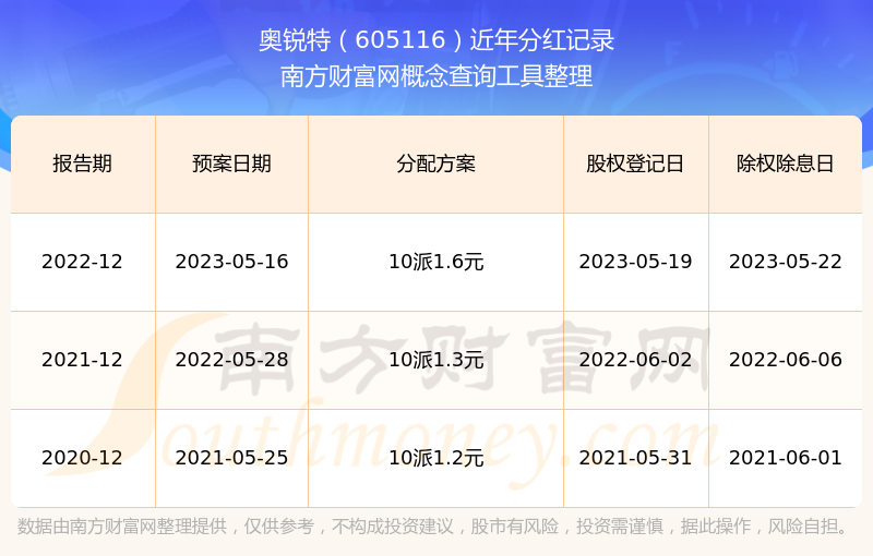 奧銳特最新一次公布的分紅方案為10派1.6元。本次權(quán)益分派股權(quán)登記日為2023年5月19日,除權(quán)除息日為2023年5月22日,派息日為2023年5月22日。