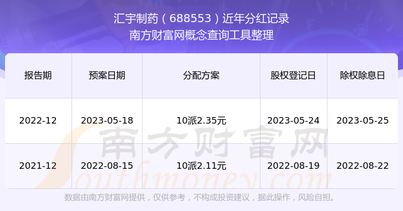 匯宇制藥最新一次公布的分紅方案:10派2.35元。