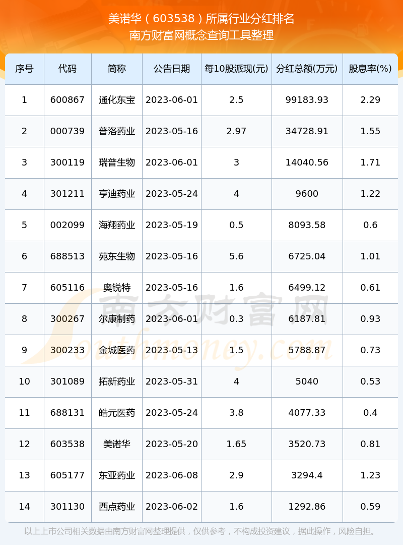 按照南方財富網(wǎng)趨勢選股系統(tǒng)統(tǒng)計,美諾華所屬行業(yè)為原料藥行業(yè),原料藥行業(yè)分紅排名情況如下表: