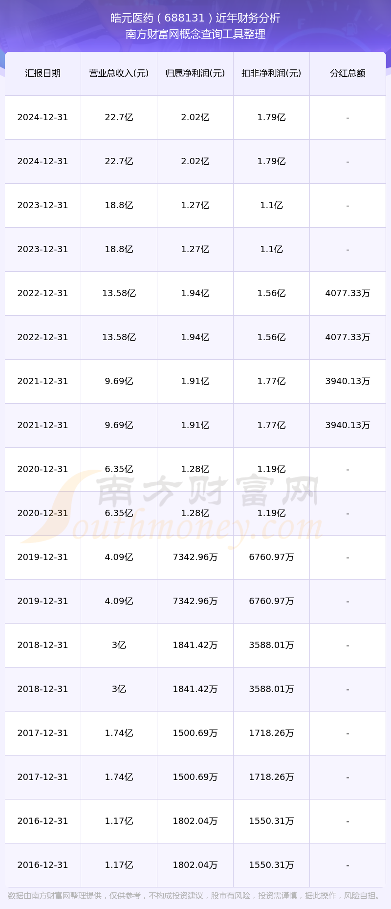 皓元醫(yī)藥歷年分紅派息情況如下表所示: