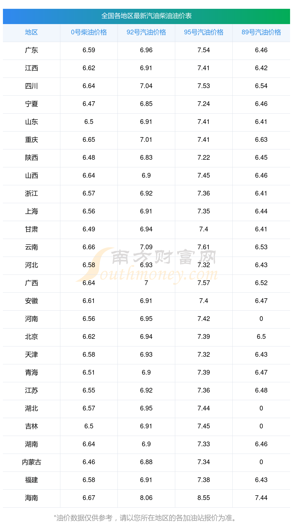 油價(jià)數(shù)據(jù)僅供參考,請(qǐng)以您所在地區(qū)的加油站報(bào)價(jià)為準(zhǔn)。南方財(cái)富網(wǎng)發(fā)布此信息的目的在于傳播更多信息,對(duì)使用該油價(jià)信息所導(dǎo)致的結(jié)果概不承擔(dān)任何責(zé)任。