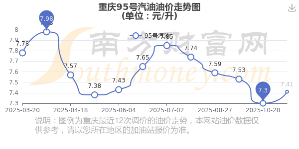 11月13日,重慶95號(hào)汽油的價(jià)格是7.41元每升,本次的調(diào)整時(shí)間為11月11日,對(duì)比上次的調(diào)整升了0.11元,升1.507%,下次調(diào)整時(shí)間為11月24日24時(shí),還有11.1天。