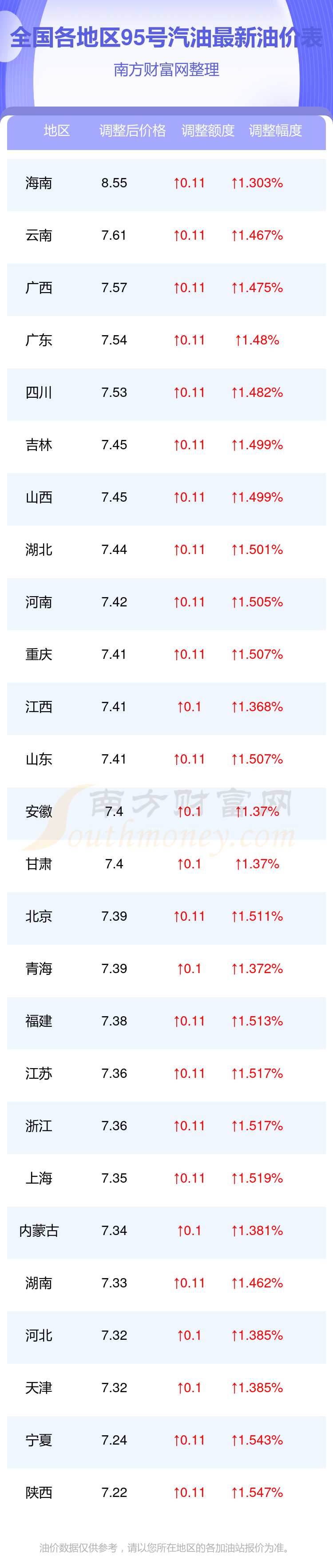 全國(guó)各地區(qū)95號(hào)汽油油價(jià)一覽表
