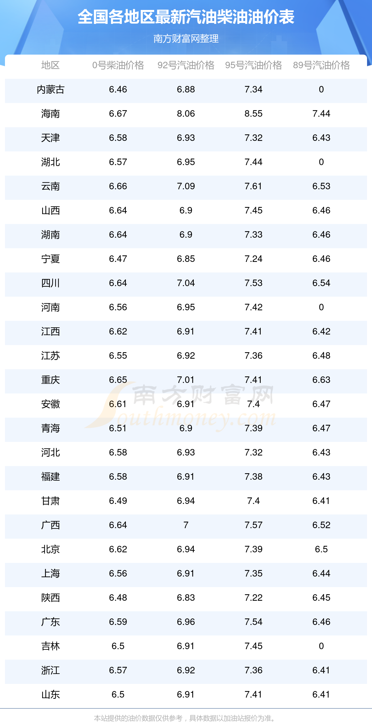以上數(shù)據(jù)僅供參考,請(qǐng)以您所在地區(qū)的加油站實(shí)際售價(jià)為準(zhǔn)。南方財(cái)富網(wǎng)發(fā)布此信息的目的在于傳播更多信息,對(duì)使用該油價(jià)信息所導(dǎo)致的結(jié)果概不承擔(dān)責(zé)任。