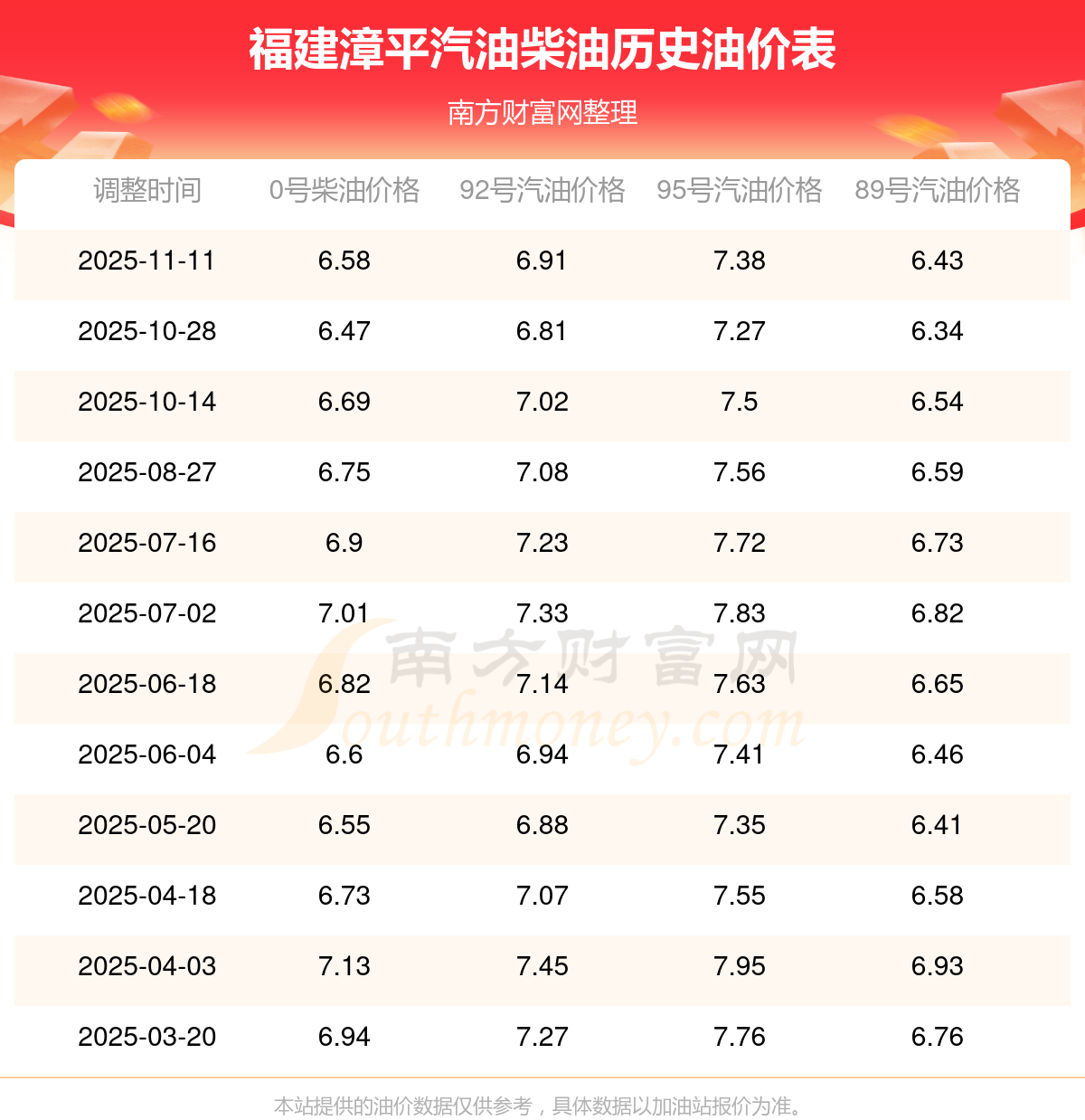 福建漳平汽油、柴油11月13日每升的價(jià)格為11月11日調(diào)整后的價(jià)格:92號(hào)汽油6.91元;95號(hào)汽油7.38元;89號(hào)汽油6.43元;0號(hào)柴油6.58元。