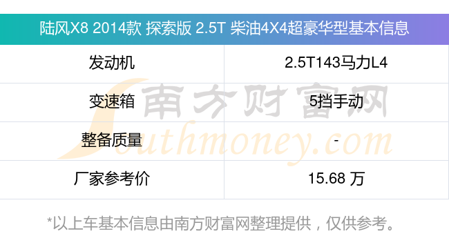 陸風X8 2014款 探索版 2.5T 柴油4X4超豪華型動力上配備的是一臺2.5T143馬力L4渦輪增壓發(fā)動機,匹配的是5擋手動擋變速箱,燃料形式為柴油,廠家參考價15.68萬元。