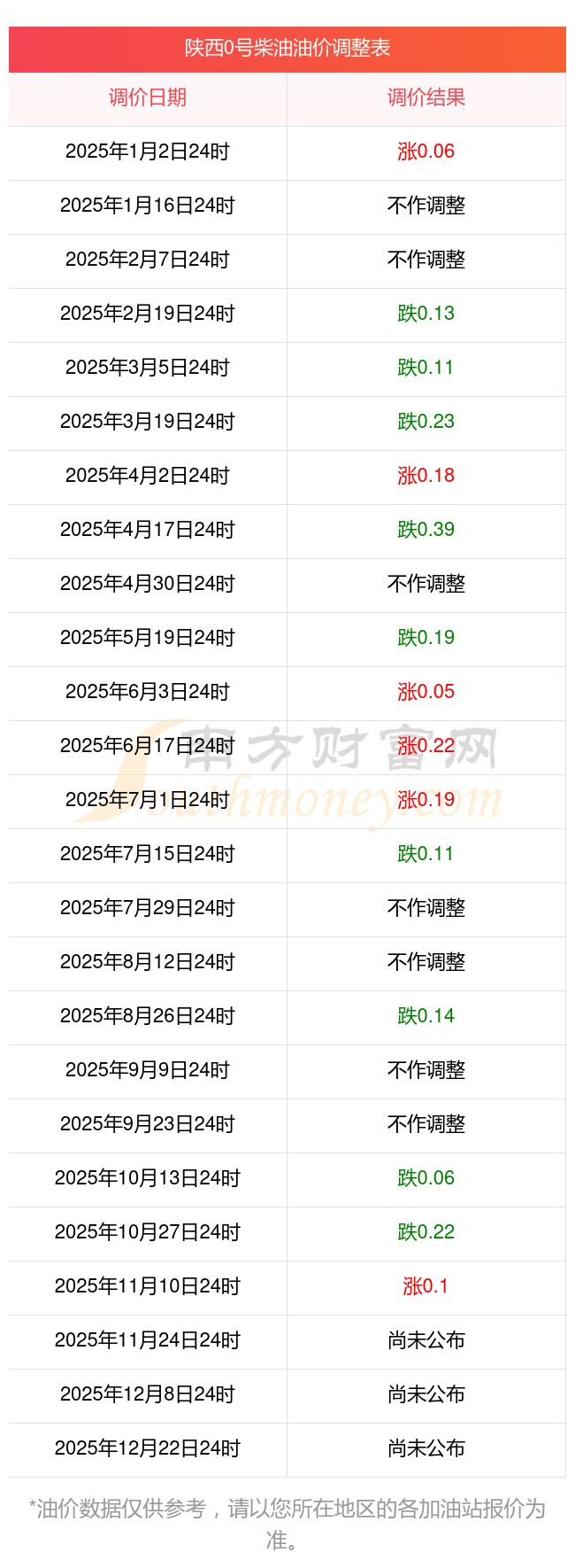 11月13日,陜西0號(hào)柴油的價(jià)格是6.48元每升,本次的調(diào)整時(shí)間為11月11日,對(duì)比上次的調(diào)整升了0.1元,升1.567%,下次調(diào)整時(shí)間為11月24日24時(shí),還有11.07天。