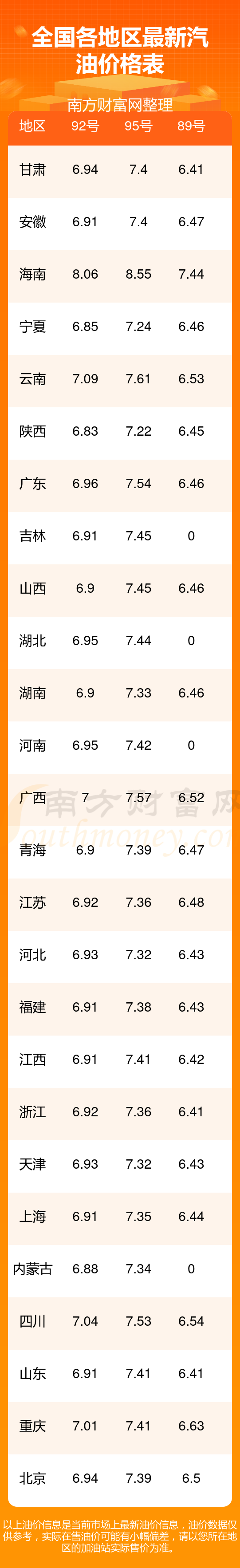 95號汽油平均價(jià)格:7元每升,其中,最高為海南,價(jià)格為8.55元/升,最低為陜西,價(jià)格為7.22元/升。