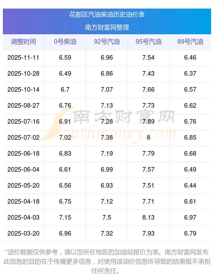 11月13日花都區(qū)汽油柴油每升的價格為11月11日調(diào)整后的價格,具體如下:92號汽油6.96元;95號汽油7.54元;89號汽油6.46元;0號柴油6.59元。