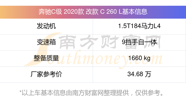 奔馳C級 2020款 改款 C 260 L搭載了一臺1.5T184馬力L4渦輪增壓發(fā)動機,采用9擋手自一體自動檔變速箱,常規(guī)整備質(zhì)量1660kg,廠家參考價34.68萬元。