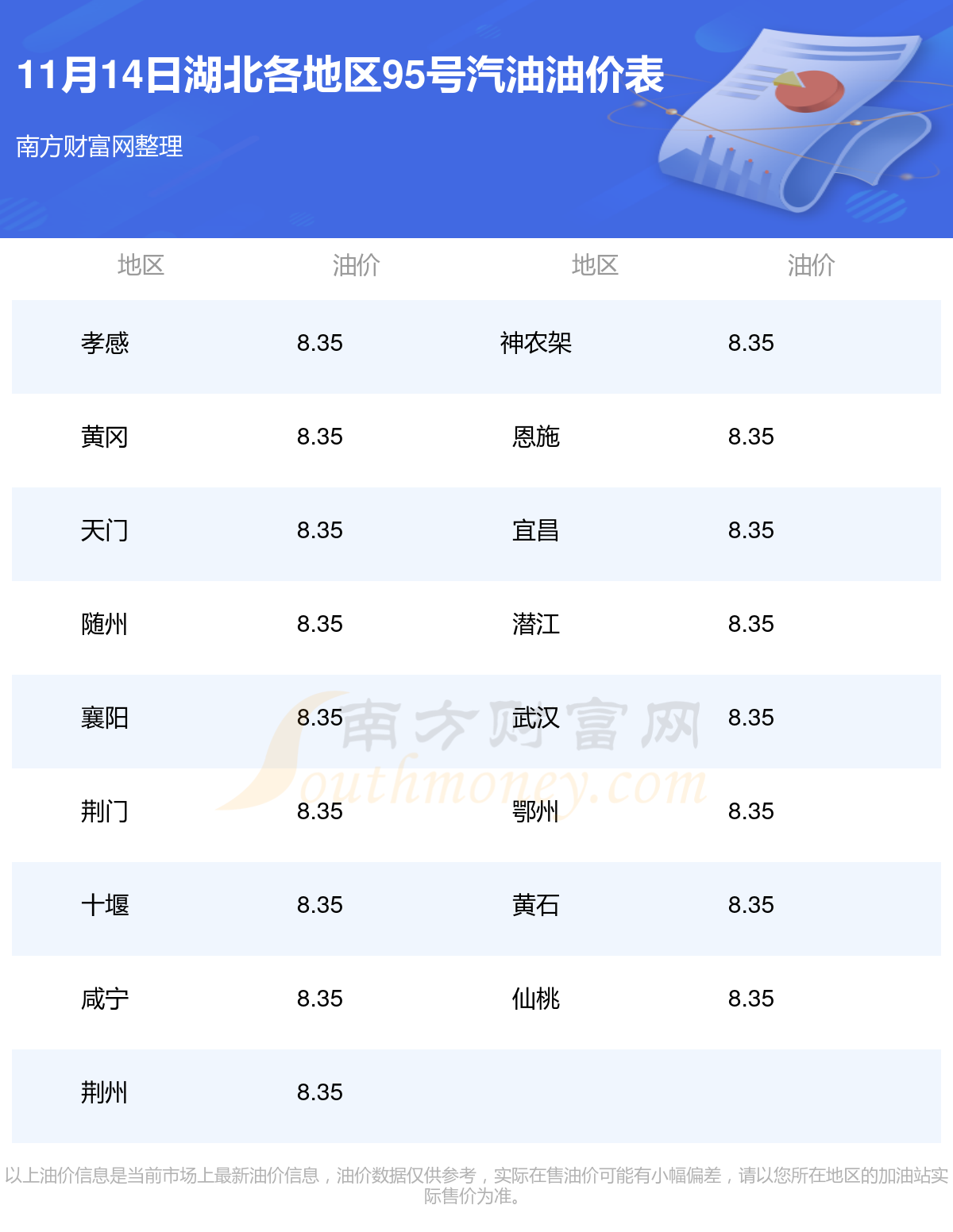 湖北各地區(qū)最新95號(hào)汽油油價(jià)表