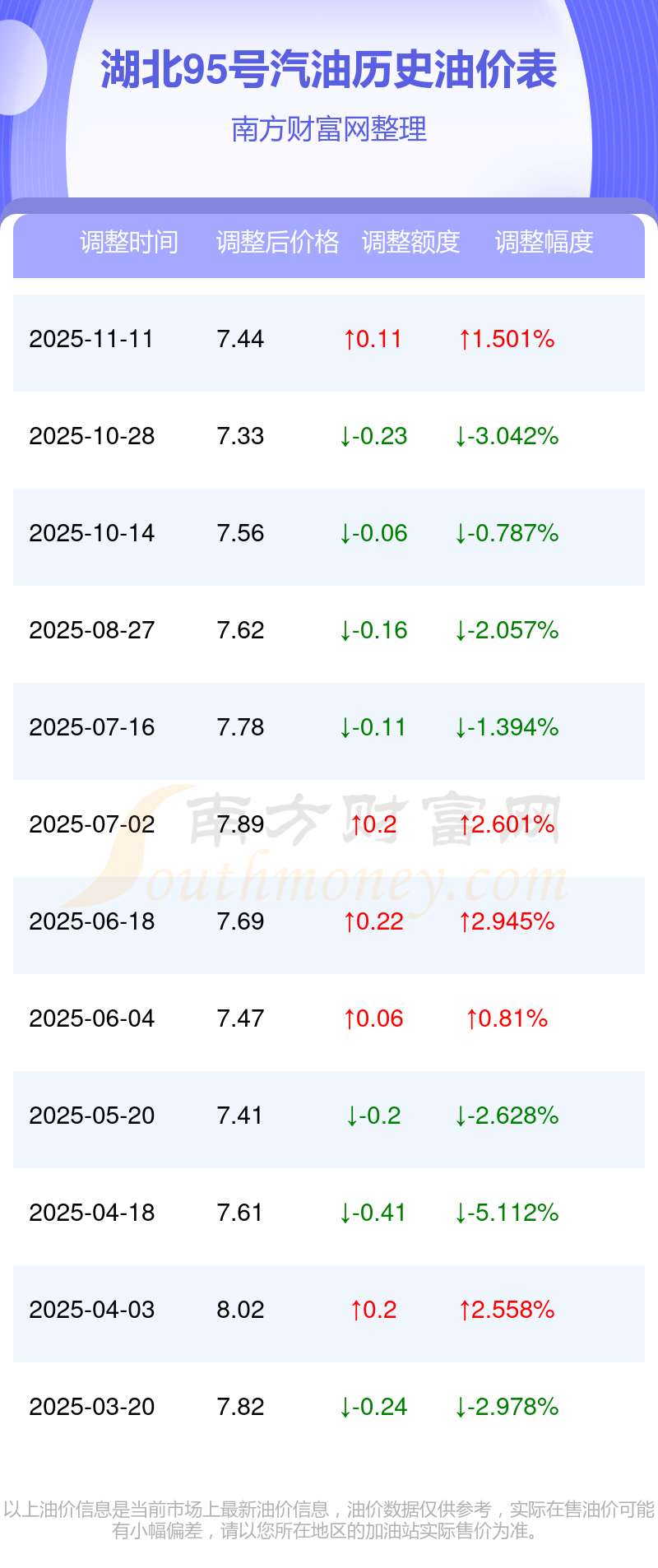 11月14日湖北95號(hào)汽油最新價(jià)格7.44元/升,調(diào)整時(shí)間為11月11日,相對(duì)上次調(diào)整增了0.11元。