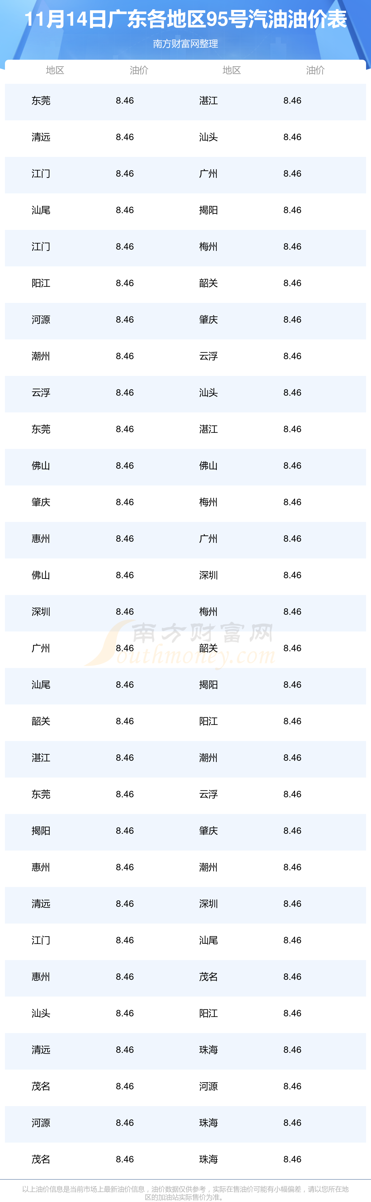 11月14日,廣東95號汽油的價格是7.54元每升,本次的調(diào)整時間為11月11日,對比上次的調(diào)整上升了0.11元,上升1.48%,下次調(diào)整時間為11月24日24時,還有10.88天。