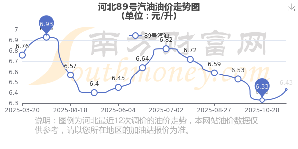 11月14日河北89號(hào)汽油的價(jià)格是11月11日調(diào)整后的價(jià)格,具體是6.43元/升,本輪河北89號(hào)汽油油價(jià)升了0.1元。