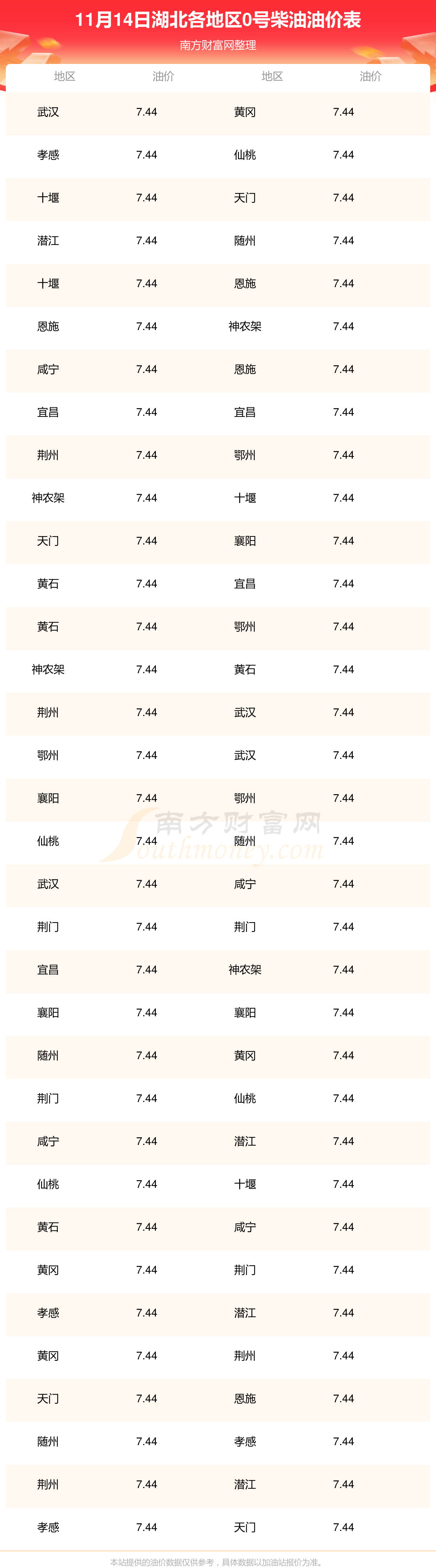 湖北各地區(qū)最新0號(hào)柴油油價(jià)表