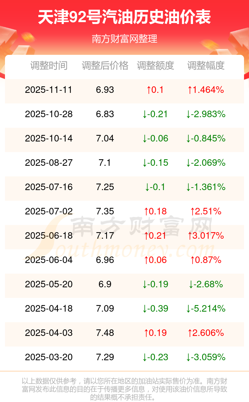 11月14日,天津92號(hào)汽油的價(jià)格是6.93元每升,本次的調(diào)整時(shí)間為11月11日,對(duì)比上次的調(diào)整上調(diào)了0.1元,上調(diào)1.464%,下次調(diào)整時(shí)間為11月24日24時(shí),還有10.81天。