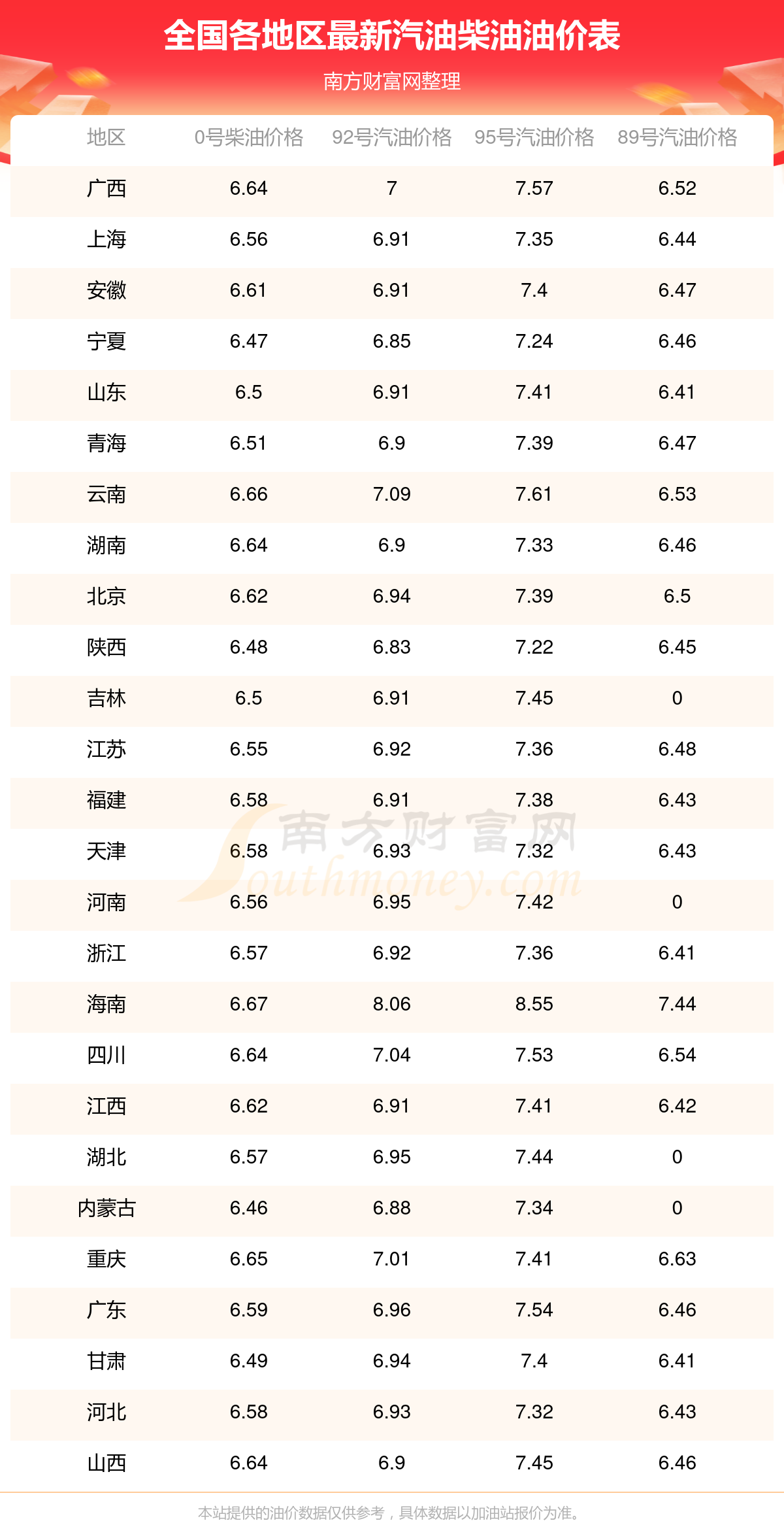 油價(jià)數(shù)據(jù)僅供參考,請(qǐng)以您所在地區(qū)的加油站報(bào)價(jià)為準(zhǔn)。南方財(cái)富網(wǎng)發(fā)布此信息的目的在于傳播更多信息,對(duì)使用該油價(jià)信息所導(dǎo)致的結(jié)果概不承擔(dān)任何責(zé)任。