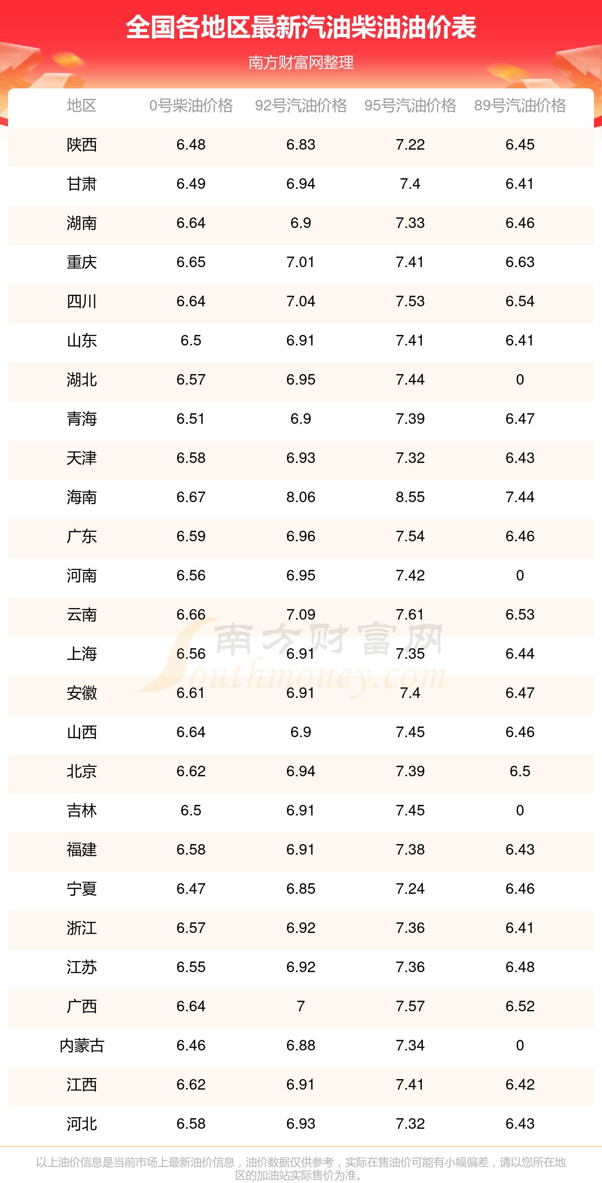 2025年全國(guó)各地區(qū)汽油價(jià)格表