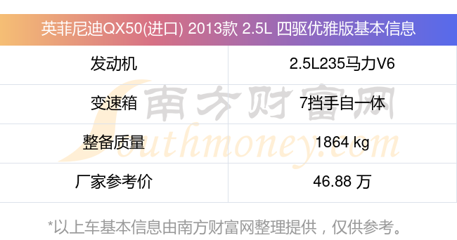 英菲尼迪QX50(進(jìn)口) 2013款 2.5L 四驅(qū)優(yōu)雅版動(dòng)力上搭載的是一臺(tái)2.5L235馬力V6自然吸氣發(fā)動(dòng)機(jī),匹配7擋手自一體自動(dòng)檔變速箱,燃料形式為汽油,常規(guī)整備質(zhì)量1864kg,廠家參考價(jià)46.88萬(wàn)元。