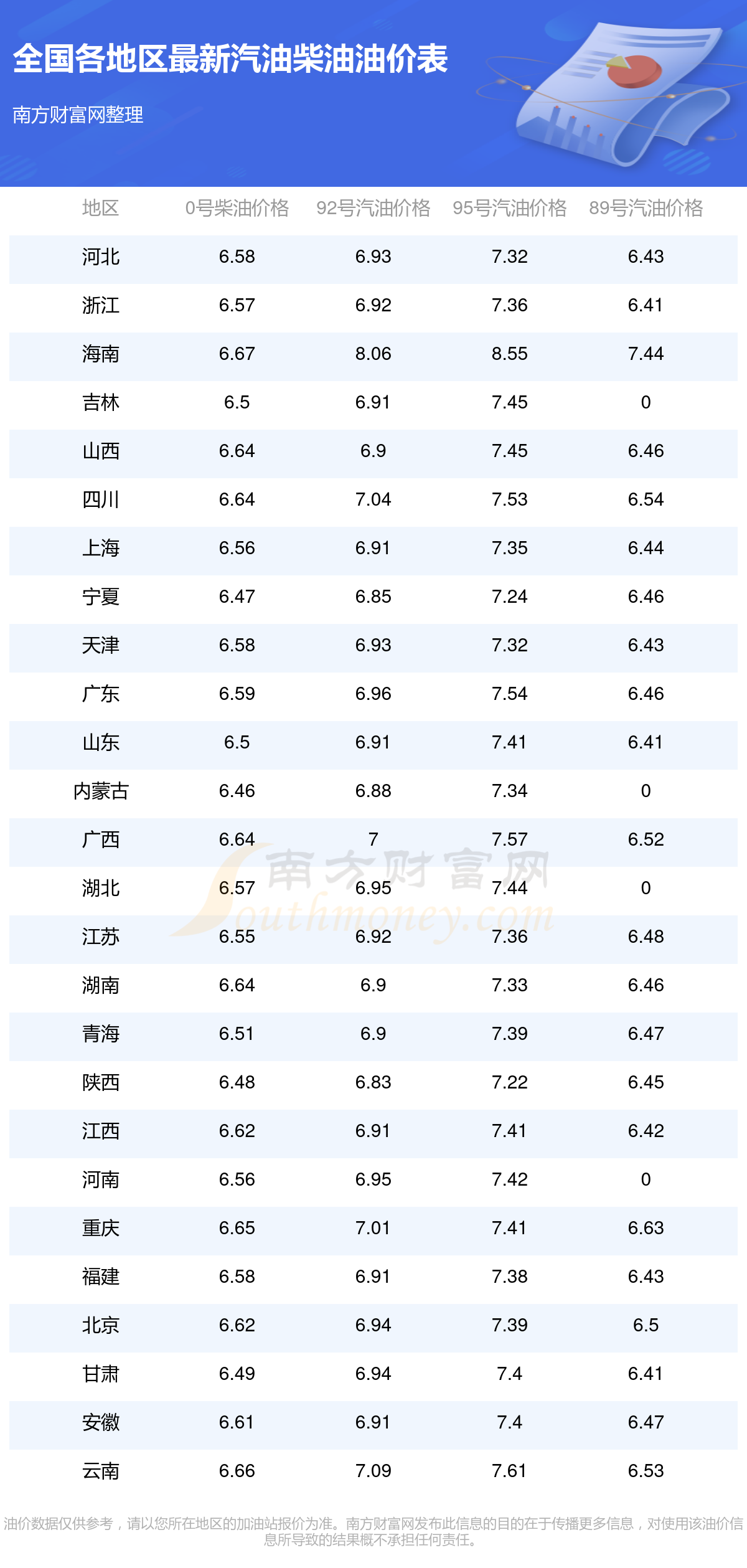 全國(guó)各地區(qū)2025年最新油價(jià)表