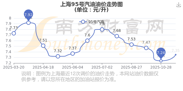 11月14日,上海95號(hào)汽油的價(jià)格是7.35元每升,本次的調(diào)整時(shí)間為11月11日,對(duì)比上次的調(diào)整上調(diào)了0.11元,上調(diào)1.519%,11月24日24時(shí)為下一輪油價(jià)調(diào)整時(shí)間,還有10.77天。
