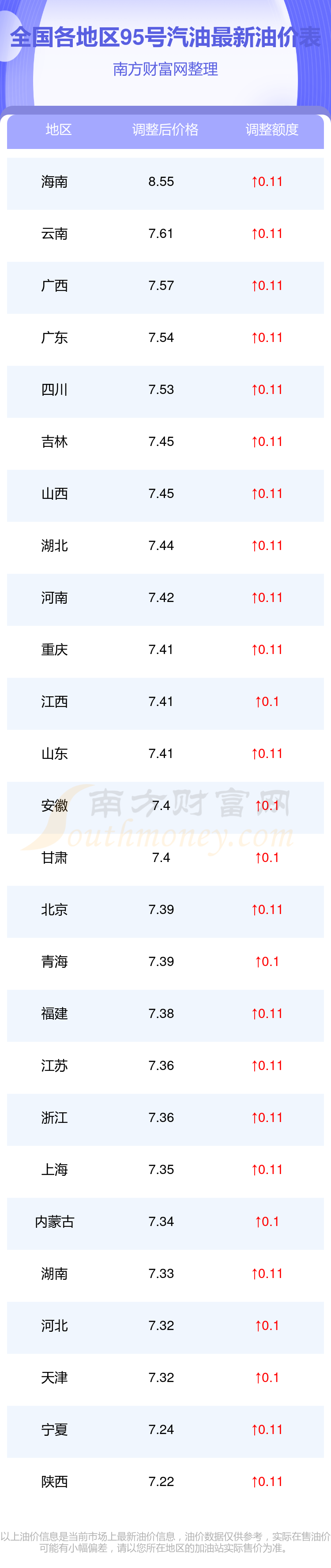 全國(guó)各地區(qū)95號(hào)汽油油價(jià)一覽表